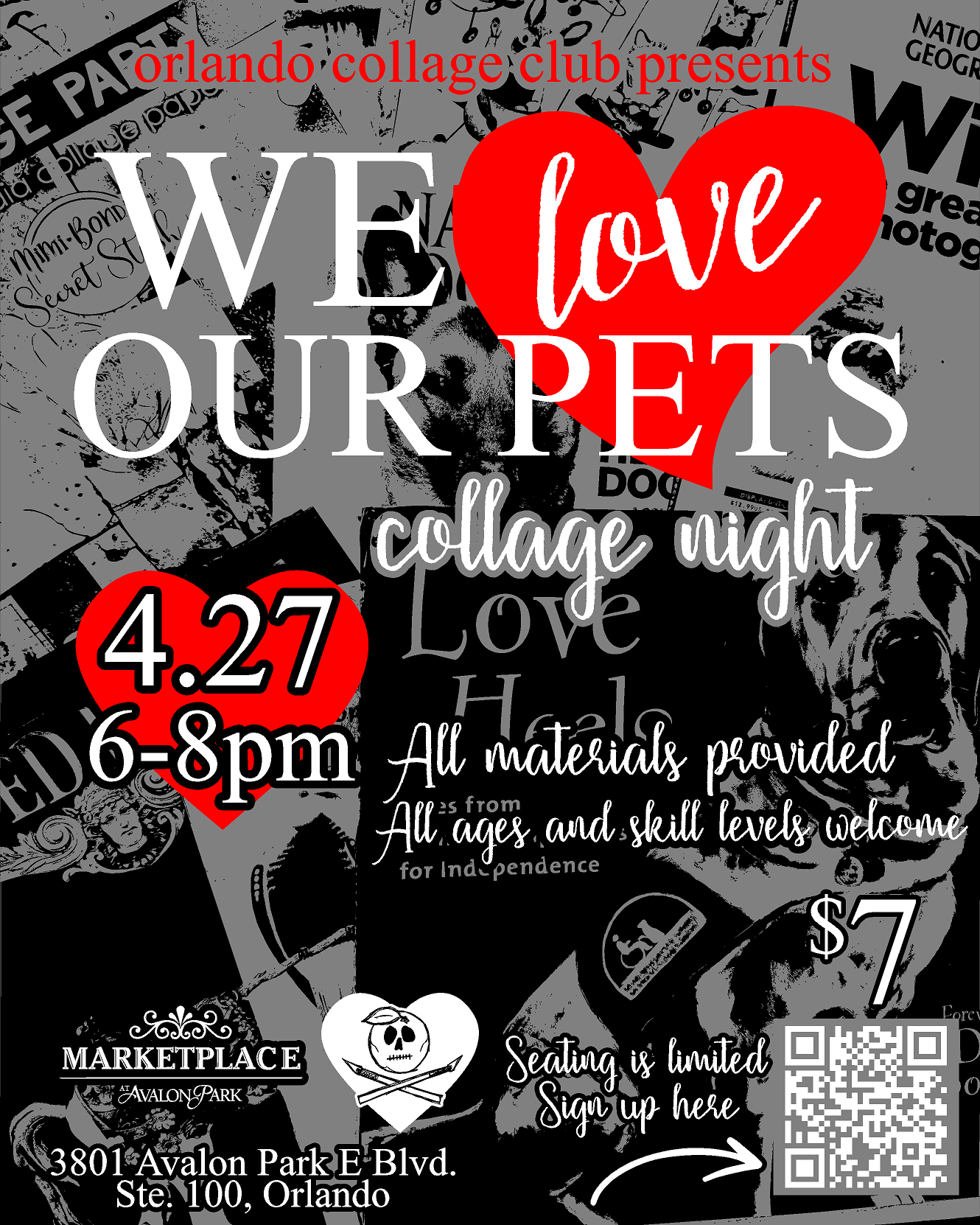 The Orlando Collage Club is hosting We Love Our Pets Collage Night at the Marketplace at Avalon Park on April 27 from 6-8 PM and we want you there.
