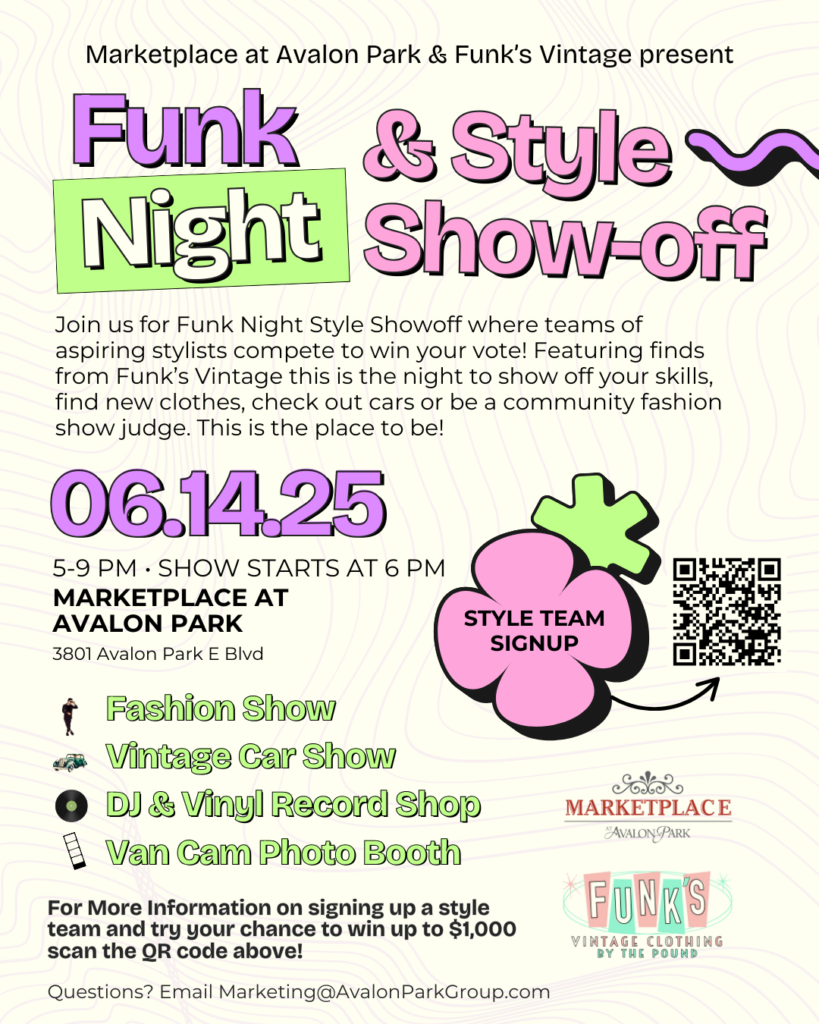 The Marketplace at Avalon Park, in partnership with Funk’s Vintage Clothing, is excited to host a Style Show-Off on June 14th. Teams of up to five participants can register for the chance to win up to $1,000 in cash prizes.