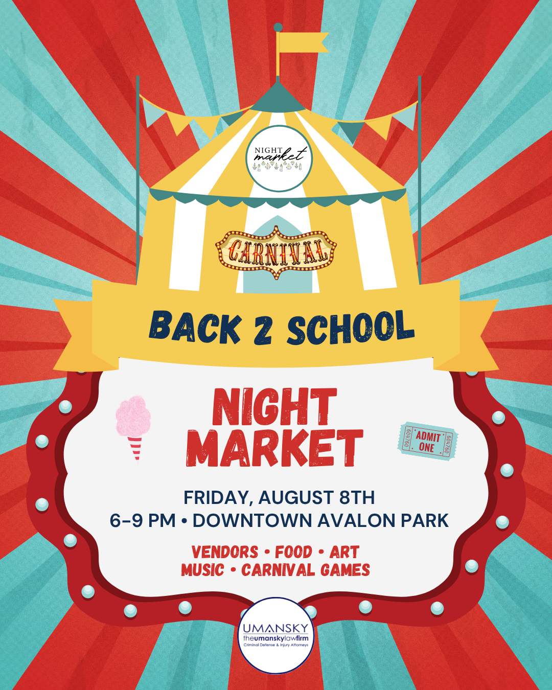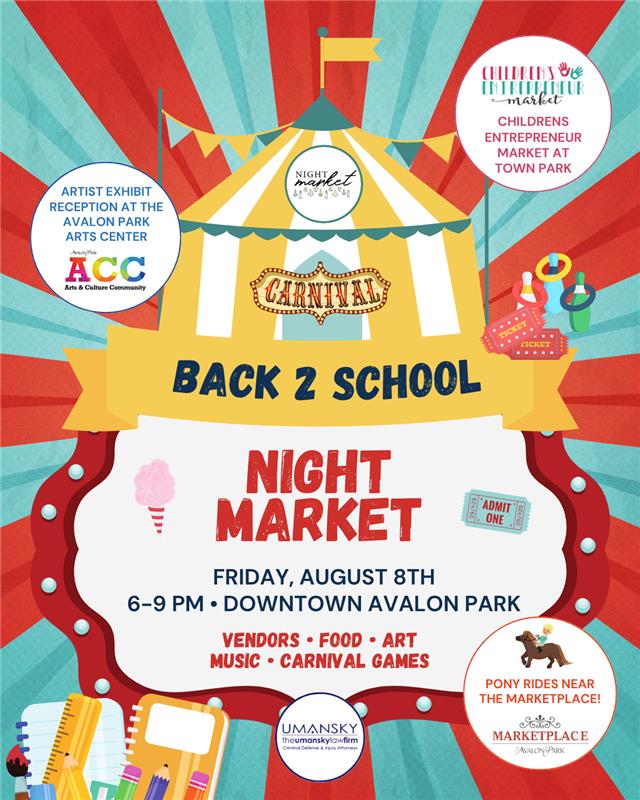 Celebrate the start of a new school year at the Back 2 School Night Market on Friday, August 8th from 6–9 PM in Downtown Avalon Park. This fun-filled evening has something for the whole family, with food, music, shopping, and carnival-style games.