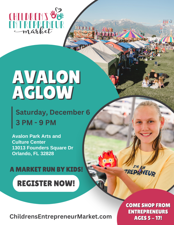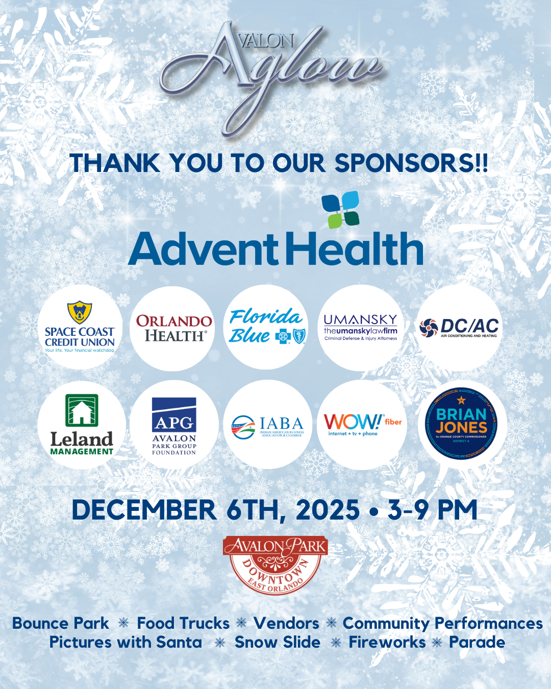 Join us for Avalon Aglow on December 6th for a night of holiday fun with family and friends! The event is from 3 p.m. to 9 p.m., ending with fireworks at 9. For more information on this event and others, visit the Avalon Park website or call 407-658-6565.