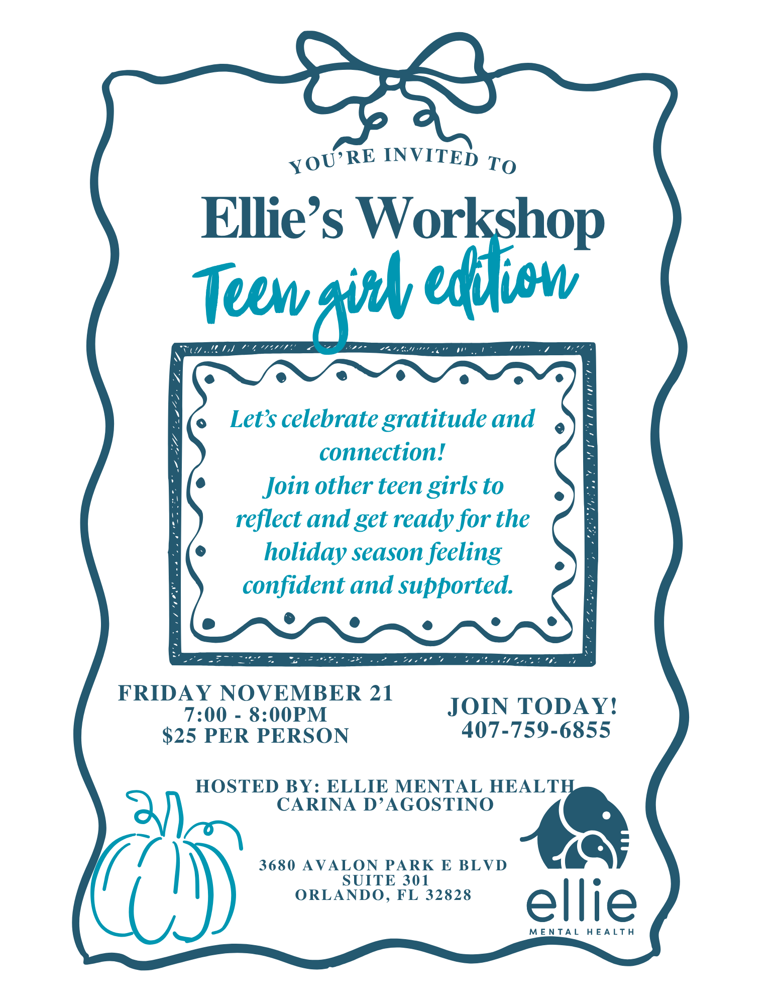 Celebrate gratitude, connection, and confidence this holiday season. Join other teen girls for a supportive and uplifting workshop focused on reflection, friendship, and emotional wellness. Together, participants will explore ways to feel grounded and supported as the holidays approach.
