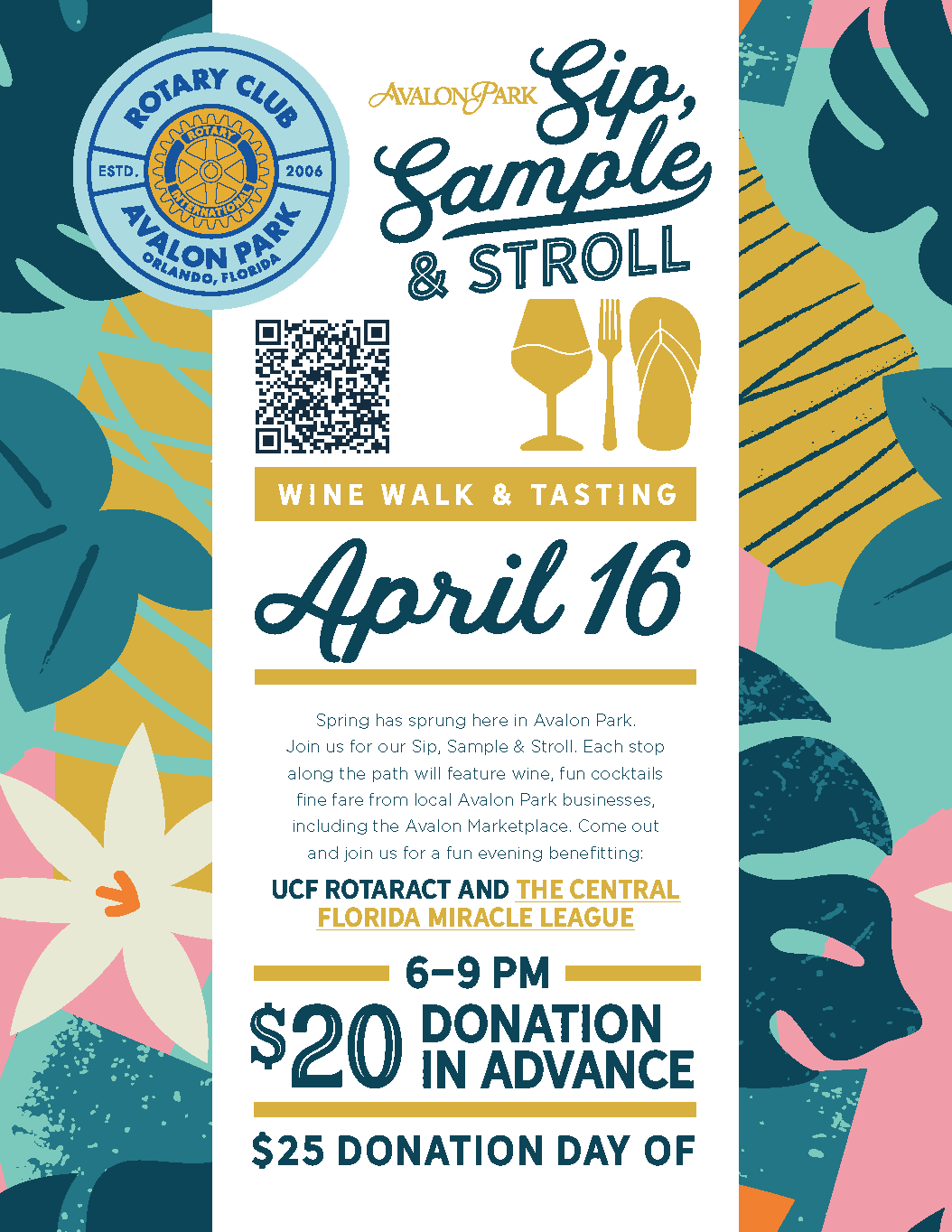 Spring is in the air! Join the Rotary Club of Avalon Park for Sip, Sample & Stroll – a Wine Walk & Tasting on April 16 from 6–9 PM. Enjoy wine, craft cocktails, and delicious bites from local Avalon Park businesses as you stroll the neighborhood—all while supporting UCF Rotaract and the Central Florida Miracle League.