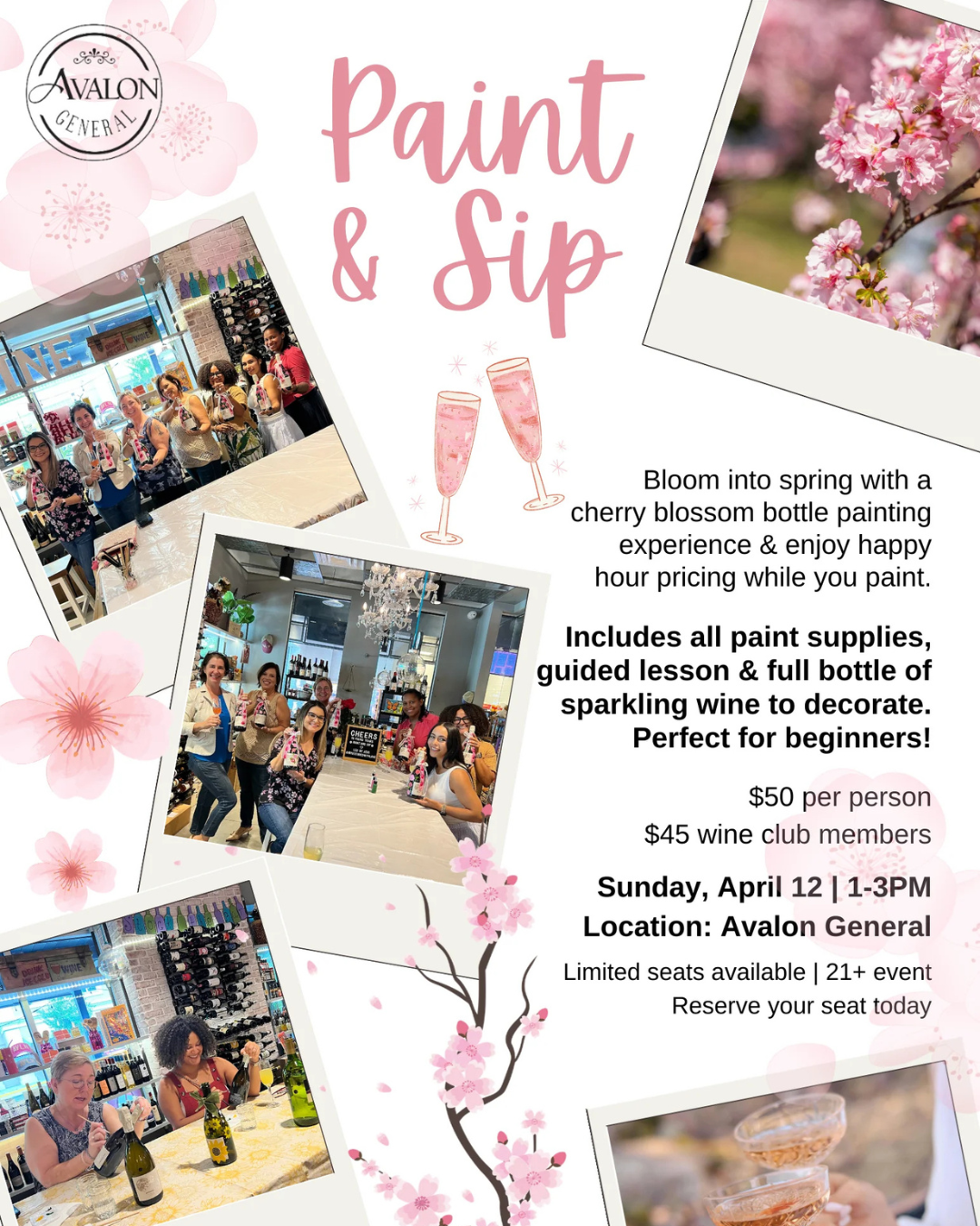 Paint & Sip is BACK at Avalon General on Sunday, April 12th from 1–3 PM 🌸✨ Join us for a fun and relaxing afternoon led by local artist Jessica Beltran of Textured with Love—perfect for beginners and anyone looking to get creative!