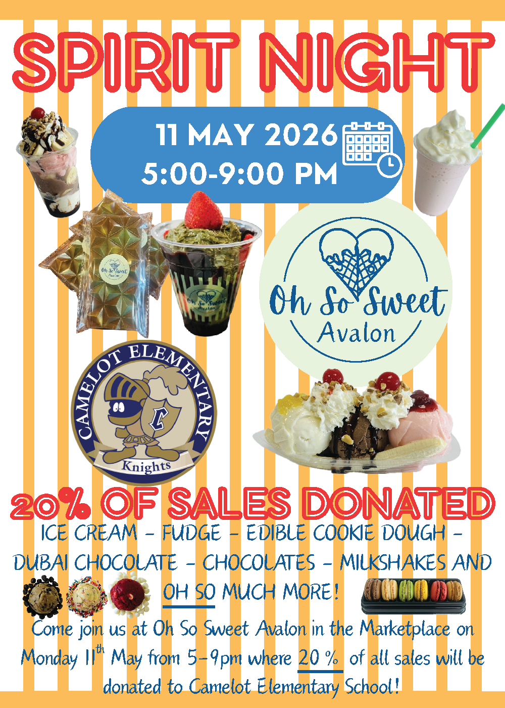 Join us for Spirit Night at Oh So Sweet Avalon in support of Camelot Elementary School.