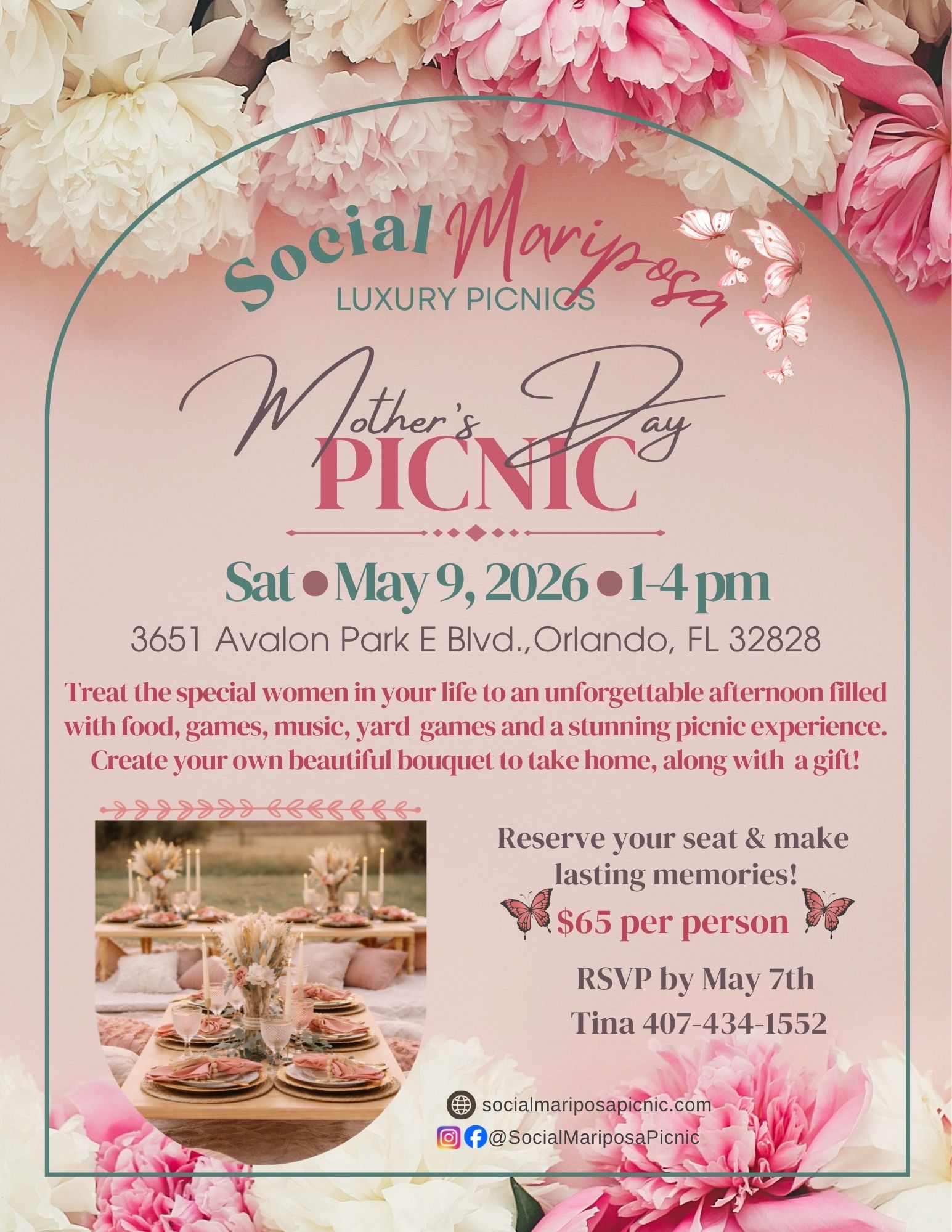 Join Social Mariposa Luxury Picnics for a Mother’s Day Picnic on Saturday, May 9th from 1–4 PM in Town Park 💕