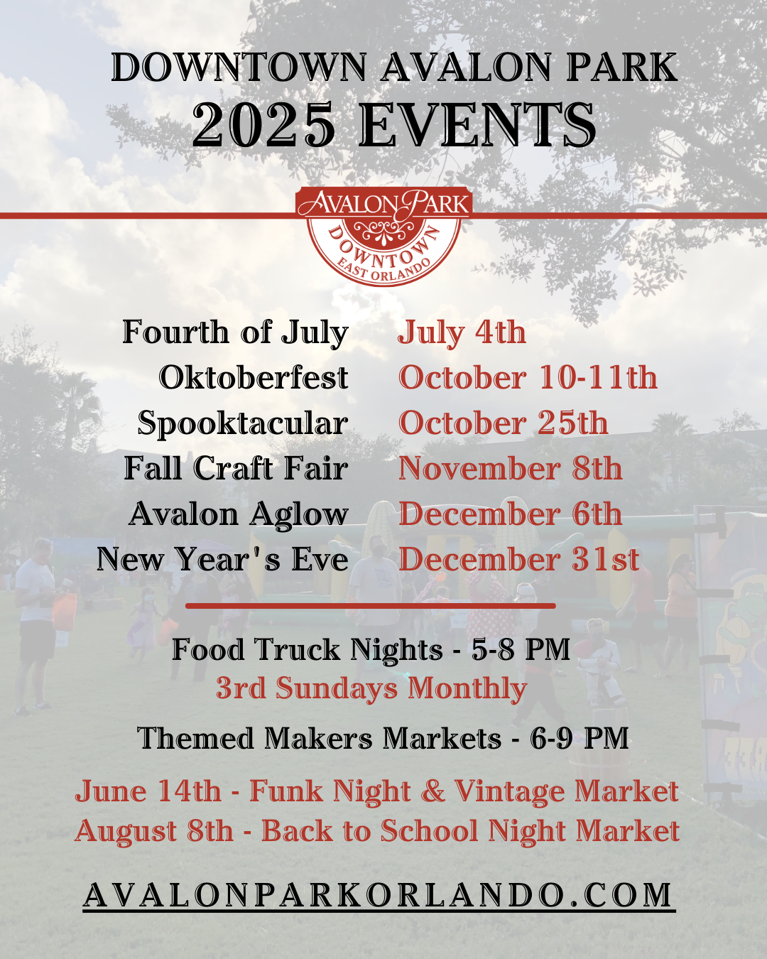To register for Avalon Park’s Food Truck Night, the 3rd Sunday of the Month, from 5:00 to 8:00 PM please click here!